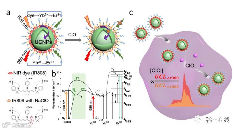图1 基于双激发比率型上转换荧光(UCL)的胞内检测示意图:(a) 980/808 nm双激发比率型UCL探针的组成和待分析物ClO-猝灭敏化上转换发光机理;(b) 从染料到上转换纳米颗粒(UCNPs)的能量传递过程;(c) 探针对胞内ClO-的比率型检测。