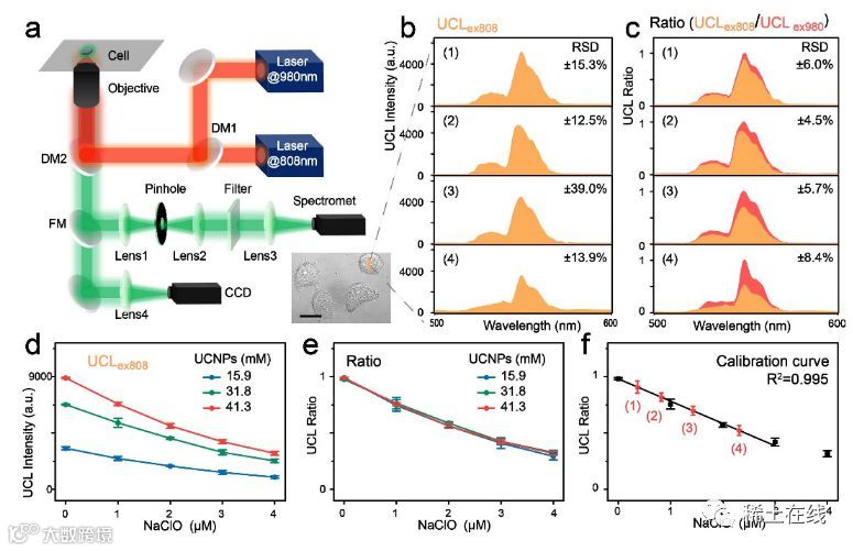 图2 (a) 近红外双激发共聚焦显微系统的光路结构示意图;(b) 探针标记的MCF-7细胞经过不同浓度ClO- (0、0.5、1和2 μM) 孵育后,在808 nm激发下的UCL光谱;(c) 双激发UCL比值(UCLex808/UCLex980),通过对图(b)对应的在980 nm激发下540 nm发光强度的归一化计算得到;在不同UCNPs浓度下,UCLex808 (d)和UCL比值(e)对ClO-的浓度依赖曲线;(f) ClO-在活细胞内标准曲线的建立和精确定量;黑点为图(e)中UCL比值的平均值;红点(1)-(4)分别为细胞经过0、0.5、1和2 μM ClO-孵育后的UCL比值。(中国科学院)
