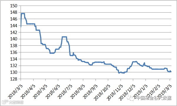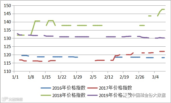 本周有五个交易日,稀土价格指数分别为130.1、130.1、130.4、130.2、130.2,本周价格较为平稳,有轻微下跌。稀土价格指数年度走势及近四年同期价格走势见20180305-20190308区间稀土价格指数走势图及2016-2019年稀土价格指数同期走势图。