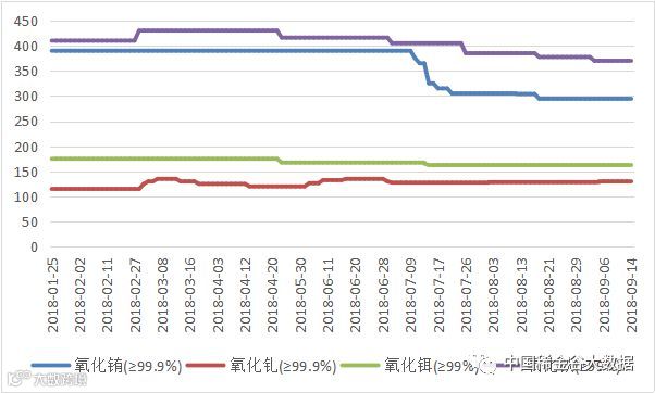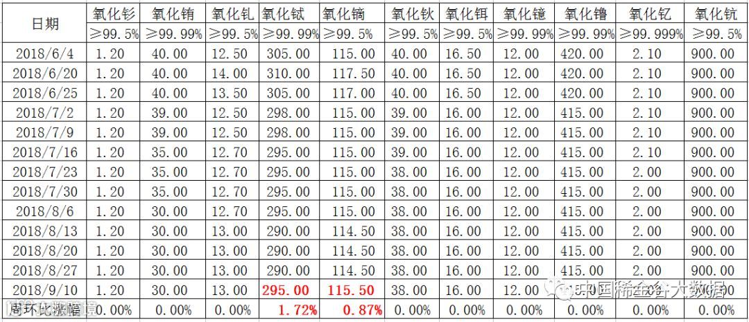 9月10日本周一南方稀土国际贸易公司发布了本周稀土物挂牌价格(见表一),与上次8月27日挂牌价格相比,氧化镝、氧化铽报价小幅上涨,其它稀土氧化物价格持平。