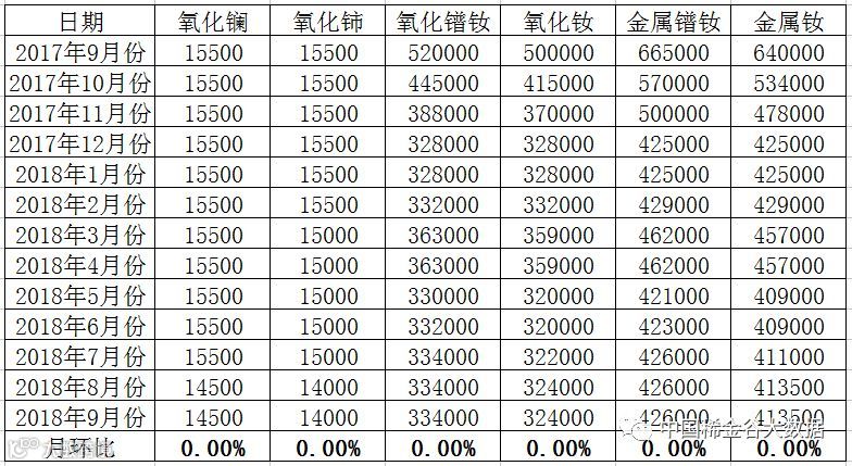 北方稀土市场营销部于9月11日发布9月份轻稀土挂牌价格(表二),与上月相比报价未发生变化。