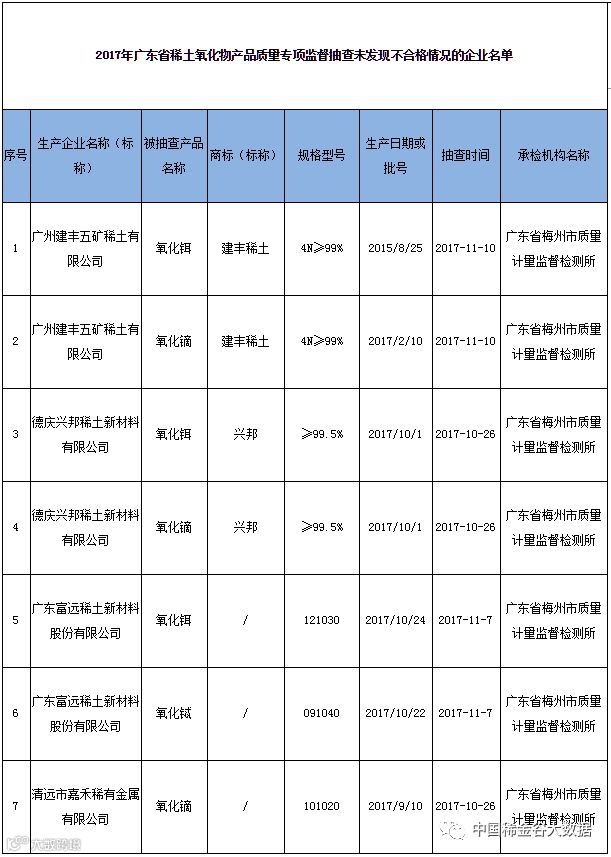 18、【广东省质监局抽查7批次稀土氧化物产品 未发现不合格情况】4月17日,广东省质量技术监督局官网发布2017年广东省稀土氧化物产品质量专项监督抽查结果公告。本次抽查了广东省内4家企业生产的7批次稀土氧化物产品,经检验,未发现不合格情况。