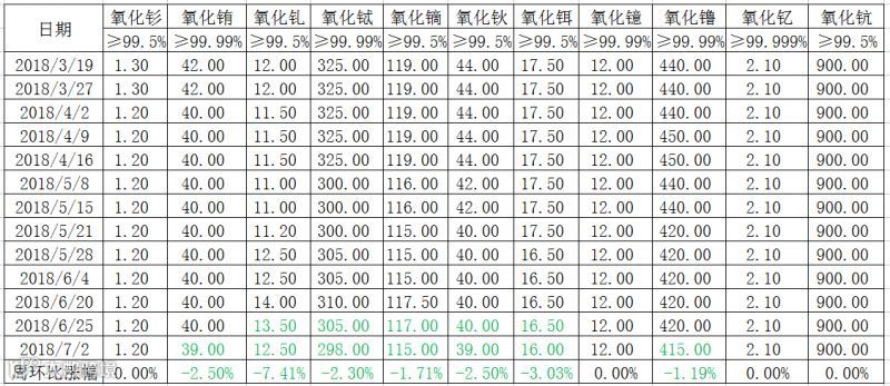 7月2日本周一南方稀土国际贸易公司发布了本周稀土物挂牌价格(见表一),与6月25日挂牌价格相比,本周价格调价涉及面较广,涉及到氧化铕、氧化钆、氧化铽、氧化镝、氧化钬、氧化铒、氧化镥7种氧化物价格,均下调,其它氧化物价格不变。具体如下: