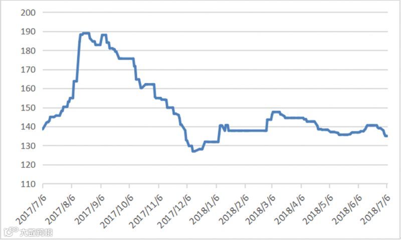 本周有五个交易日,稀土指数分别为137.9、136.2、135.1、135、135,本周稀土价格指数继上周下降之后,持续下降,虽然每周都是小幅向下微调,但累计数值还是较大。稀土价格指数近一年走势见20170706-20180706区间稀土价格指数走势图。对比2016及2017年同期,价格指数同比上涨,见图2016-2018年稀土价格指数同期走势图。从往年对比图看到,目前稀土价格指数已低于去年同期,同时企业生产环保成本增加,从目前数据来看,稀土生产企业经济效益比去年同期更差。