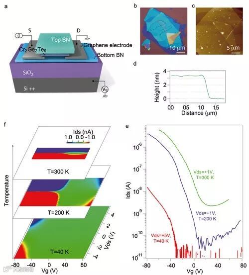 近期,由中国科学院金属研究所研究员张志东、韩拯主导,在山西大学光电研究所陈院森研究组、金属所副研究员杨腾、长沙理工大学教授丁美的主要合作下,联合国内外多家单位成功在Cr2Ge2Te6少数层本征铁磁二维半导体中利用固态门电压调控手段,实现了电荷与自旋的双重双极全电操控。该工作于7月2日在《自然-纳米科技》(Nature Nanotechnology)杂志在线发表。团队采用惰性气氛下原子层厚度的垂直组装,将3.5nm厚Cr2Ge2Te6少数层材料封装于两层氮化硼之中,解决了母材料空气中稳定性欠佳的问题。通过微纳米加工手段制备得到场效应器件,并进行系统的低温电学与磁学测量。电输运测量表明,少数层Cr2Ge2Te6在铁磁居里温度(~65K)以下,保持了载流子导通性,并且能够实现电子与空穴的双极场效应。室温下施加1V源漏电压,可得到数十微安的开态电流,开关比达到104以上。居里温度以下的低温微区磁光Kerr测量表明,该型纳米器件在门电压调控下,磁性亦能得到有效调控,并且与电输运相仿,存在双极门电压可调特性。证实了基于二维范德华铁磁半导体的自旋场效应器件的可行性。(来源:产业前沿)