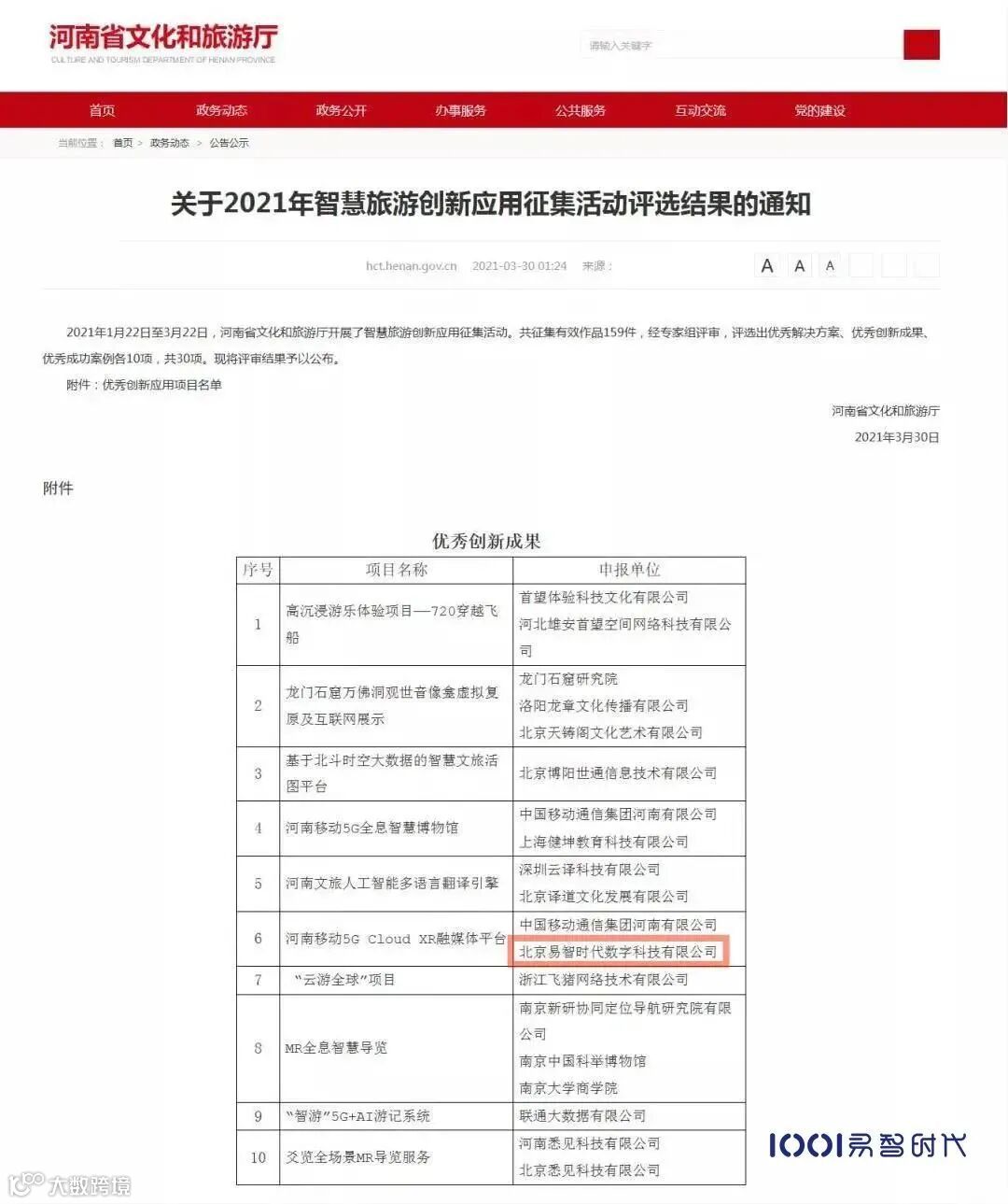 易智时代荣获河南省文化和旅游厅“2021年智慧旅游优秀创新成果”奖