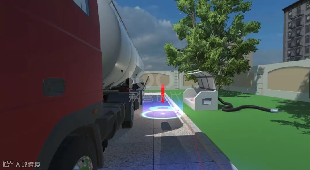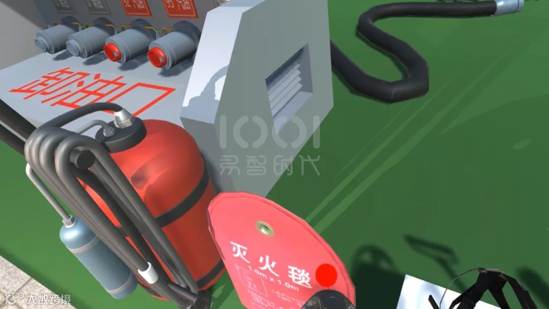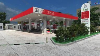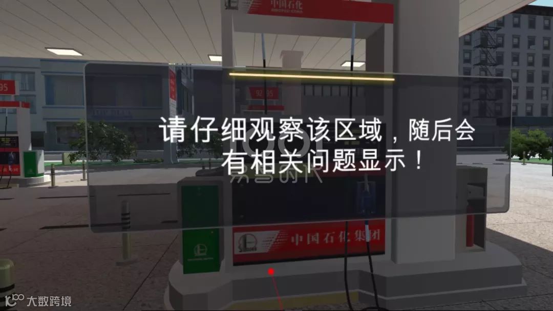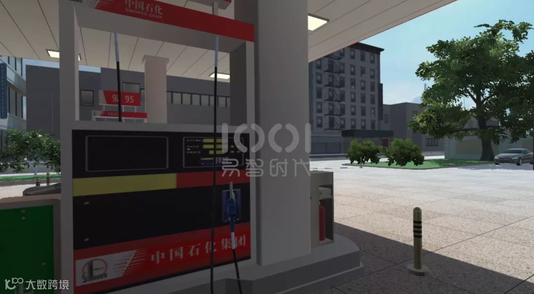 体验者通过佩戴VR设备完全沉浸于加油站场景中,技能大比武系统的场景是以中石化真实加油站场景为参照进行建模,场景中包含的所有设施均参照中石化标准加油站进行1:1建模。
