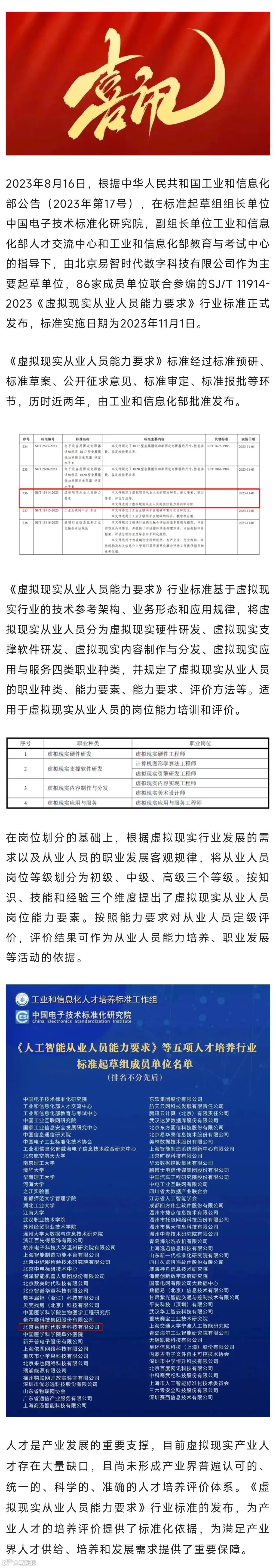 喜讯 | 由易智时代起草参编的《虚拟现实从业人员能力要求》行业标准正式发布