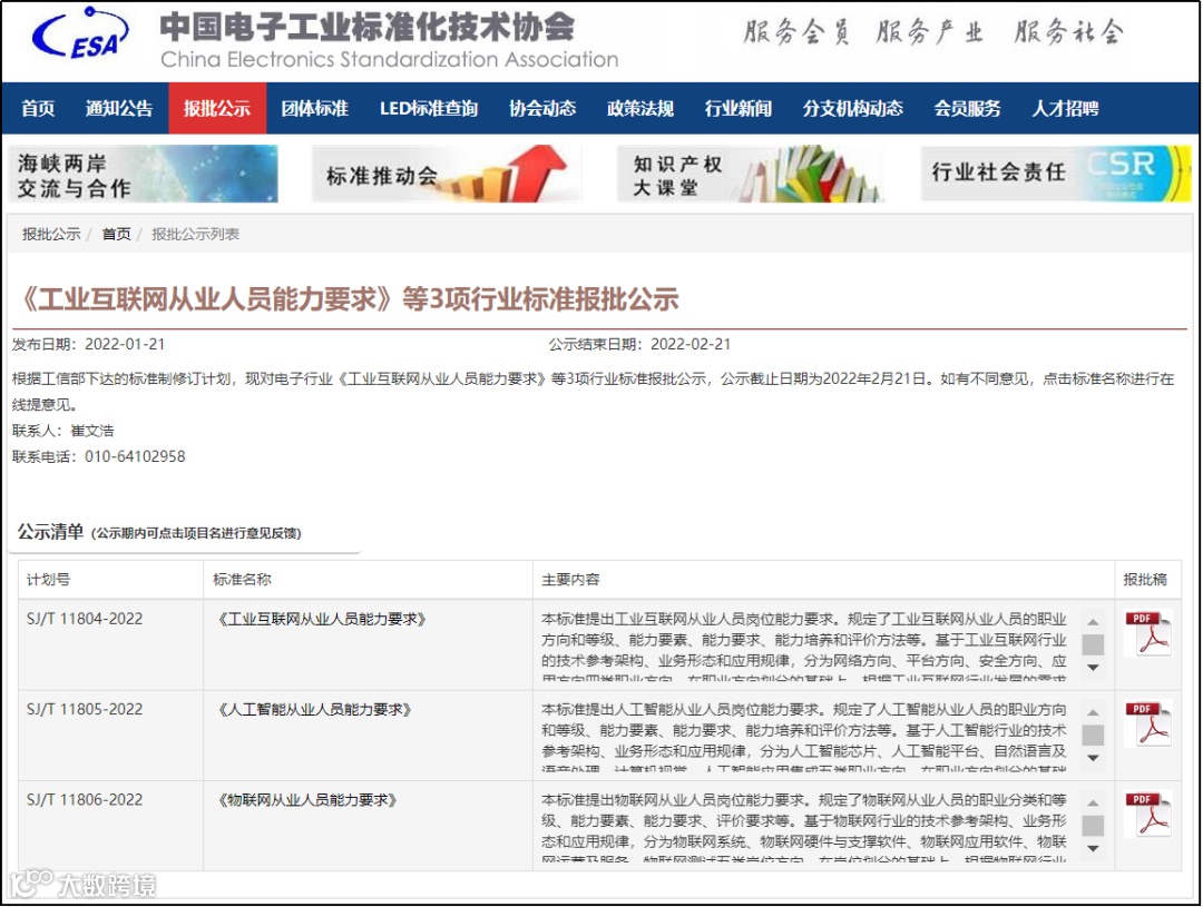 2022年1月21日,《工业互联网从业人员能力要求》等3项行业标准报批公示,计划号SJ/T 11804-2022。