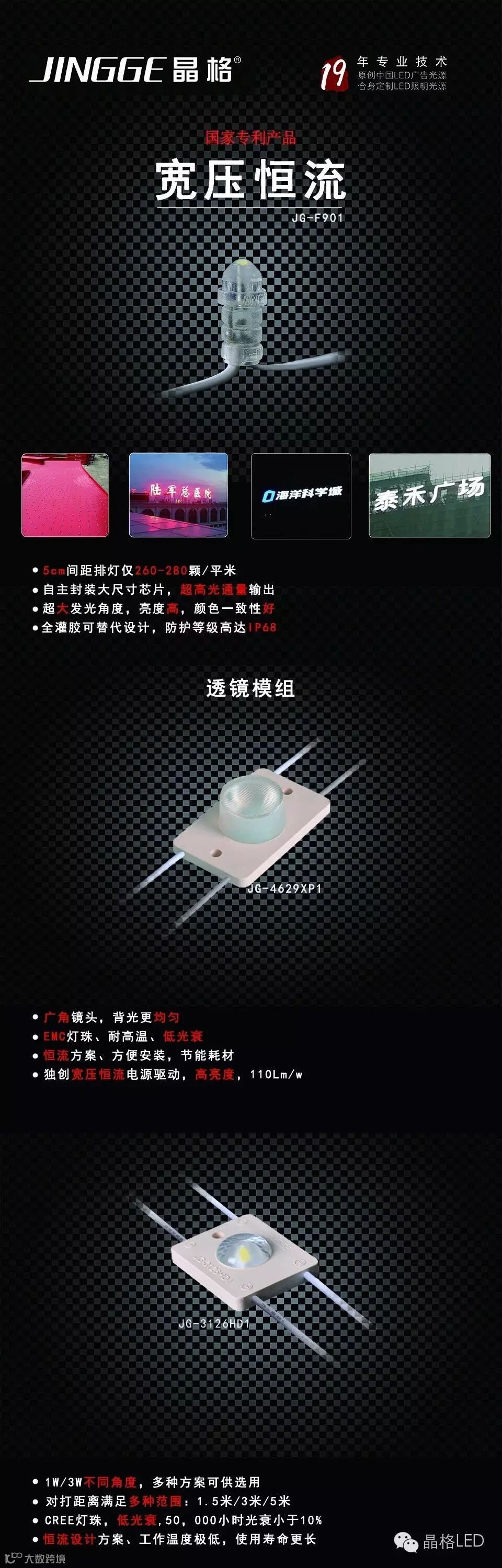 晶格一直秉承对技术的执着追求,为客户提供更好的标识解决方案,让广告光源更好的展现标识的风采,晶格人19年来坚持原创科技,朴素营销的理念,为客户合身定制LED广告光源。
