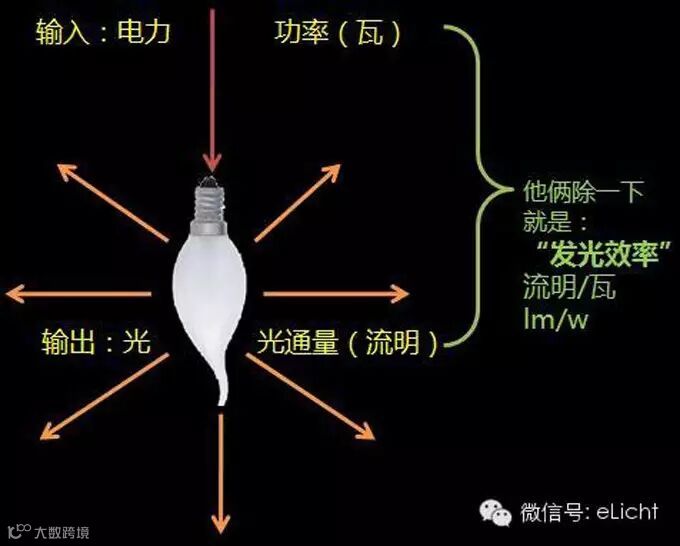 光源发出的光通量除以光源功率所得之商,简称光源的光效。单位为流明每瓦特(lm/W)。