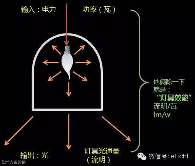在规定的使用条件下,灯具发出的总光通量与其所输入的功率之比。单位为流明每瓦特(lm/W)。