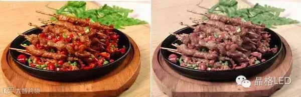 选择合适显指的照明光源,主要是根据被照物颜色来决定的,如文章开头的三组对比图中,左边的铁板串串采用了R9显色指数较高的光源,所以看起来更光泽美味;左边的红裙子也是采用了R9显色指数较高的光源,所以看起来颜色更鲜艳明亮;而左边超市的水果由于采用的光源Ra显色指数良好,所以看起来更令人垂涎欲滴。