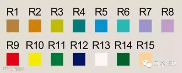 国际照明委员会(CIE)将太阳光的显色指数定为100,并规定了15个测试颜色,用R1-R15分别表示这15个颜色的显示指数。当把一个光源与规定的参考光源进行比较时,指数值为100是最好的。