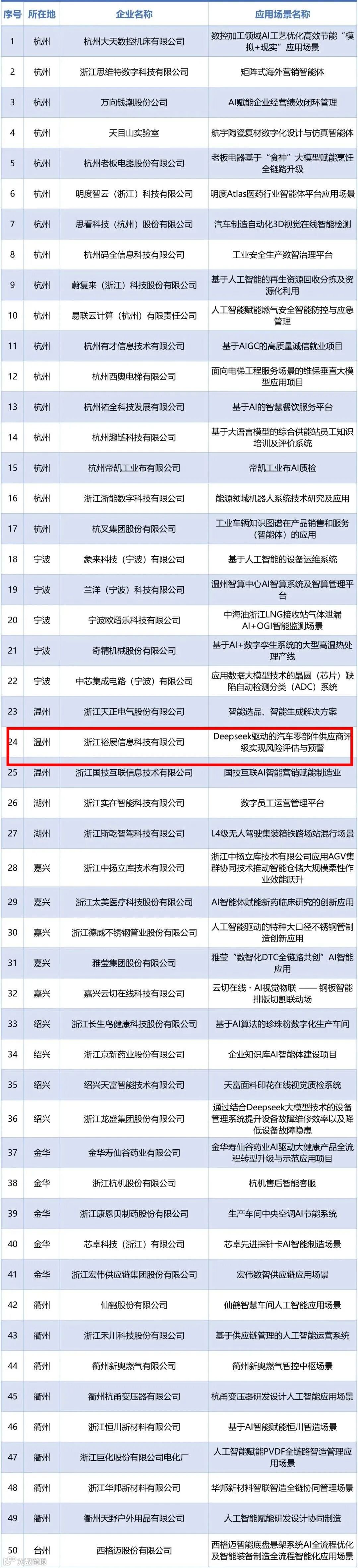 为贯彻落实好国务院深入实施“人工智能+”行动的战略部署,全面推进人工智能赋能新型工业化,加快推动人工智能创新应用,赋能产业深度转型,根据《关于开展2025年浙江省人工智能应用场景、应用标杆企业、人工智能服务商及“数智优品”遴选申报工作的通知》的有关要求,经各单位自主申报、地市推荐、专家评审等程序,确定2025年浙江省人工智能应用场景50个、应用标杆企业25家、人工智能服务商33家、“数智优品”70项。