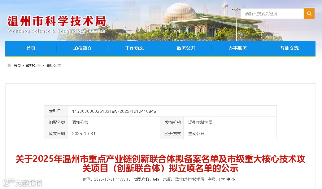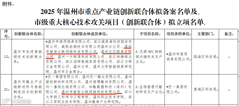近日,温州市科学技术局发布了2025年温州市重点产业链创新联合体拟备案名单及市级重大核心技术攻关项目(创新联合体)拟立项名单,中国(温州)智能谷入驻企业——温州市智安云联网络科技有限公司、温州亿芯锁具有限公司,凭借在智能制造与物联网领域的深厚积累双双入选,其中“温州市鞋业产业链新材料与智能制造技术创新联合体”为鹿城唯一入选联合体,展现了智能谷企业在产业协同创新中的强劲实力!