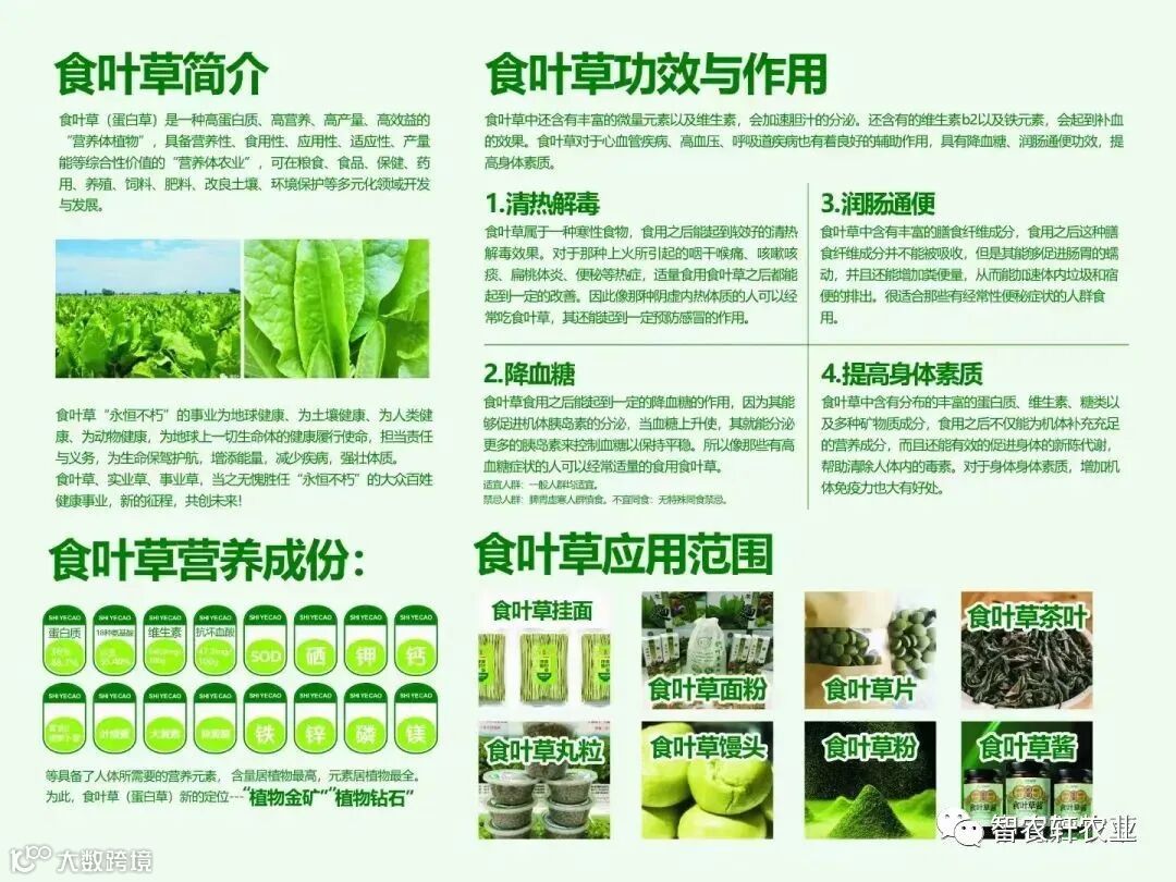 根据北京市营养源研究所检测,食叶草生物蛋白含量36%~48.7%,高于苜蓿,从产量而言优于大豆,是目前新型植物蛋白源最佳选择,是饲料应用的最佳方案之一