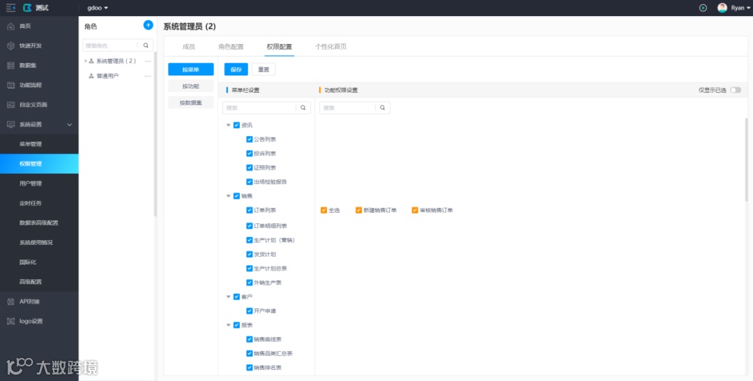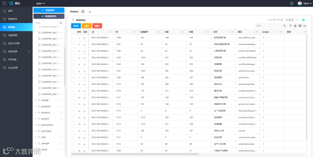 完成以上几步之后便完成数据库的对接工作,就要开始使用平台进行后续的系统搭建工作了,包括功能、数据集创建及设置,菜单、权限、用户管理,以及各项系统调试工作。