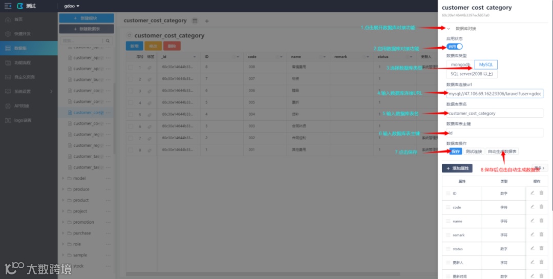 具体操作:选择一个数据表,在属性编辑窗口启用数据库对接功能。选择数据库类型,因为原有系统的数据库是MySQL,所以这里的数据库类型选择“MySQL”。然后依次输入数据库连接url(mysql://47.106.69.163:23306/laravel?user=gdoo&password=ibyKdRW),数据库表名(对应的数据库中的数据表名),数据库表主键。输入完成后点击自动生成数据表,这个表上的所有字段就都生成出来了。对接完成后在白码平台添加数据,数据会一并存储到原有系统和数据库中。