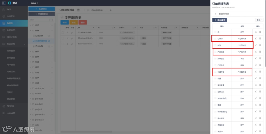 例如:订单明细表中字段的关联设置,所属订单字段关联的是订单表,类型字段关联订单类型表,产品信息字段关联产品列表。