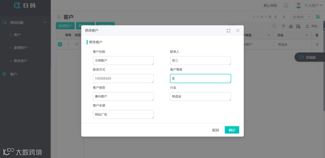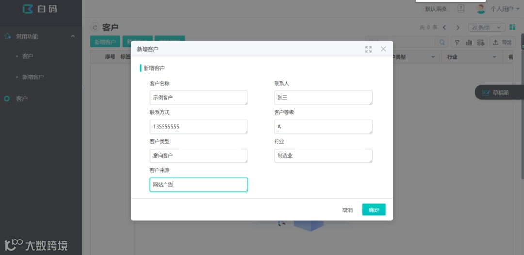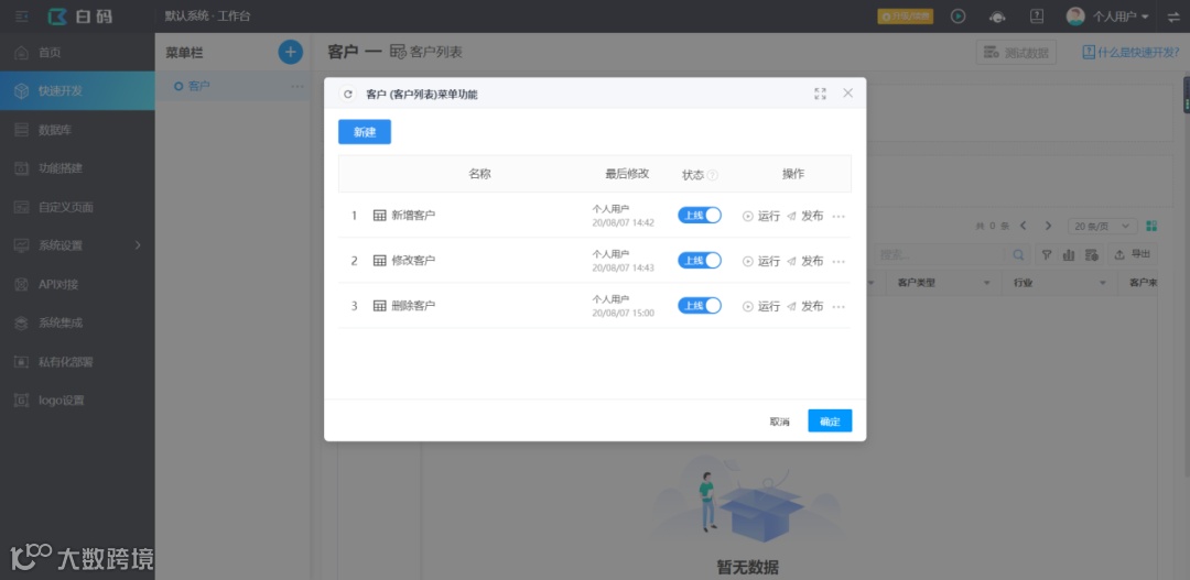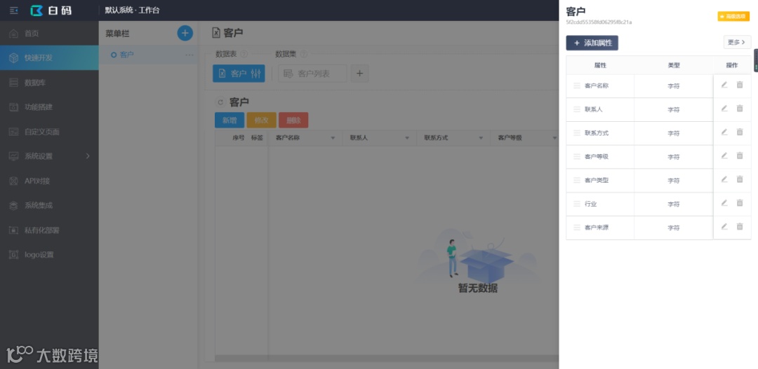 白码低代码开发平台上,有“快速开发”的功能,不需要写SQL语句就能在5分钟之内完成一个数据表的CRUD功能,接下来以“客户”数据表为例,演示如何在白码平台上快速实现一个数据表的CRUD功能。