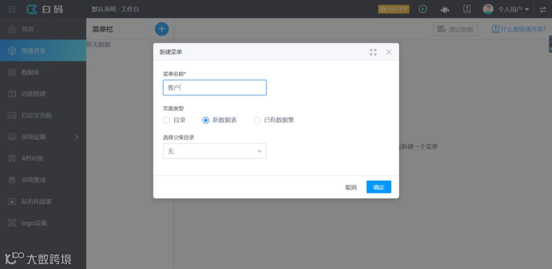 在快速开发页面,新增一个数据表菜单(根据官方的解释,这一步可以新增一个数据表和一个数据集,该数据集立即绑定到一个菜单上)