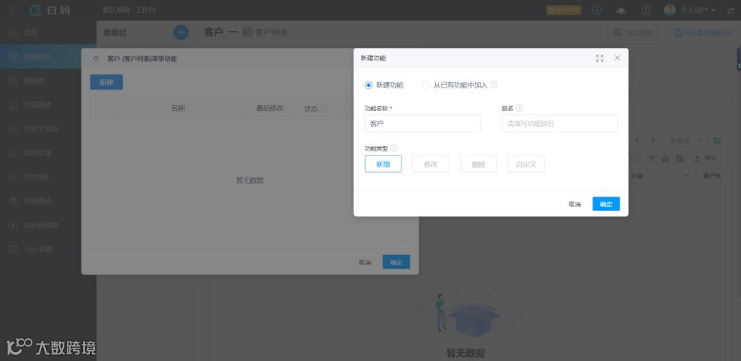 点击新建,选择功能类型,就可以快速新建当前数据表的新增功能,以此类推快速新建修改和删除功能,平台会自动生成对应数据表的最简单的新增/修改/删除功能,自定义表示空功能,用户自己从零开始搭建流程。