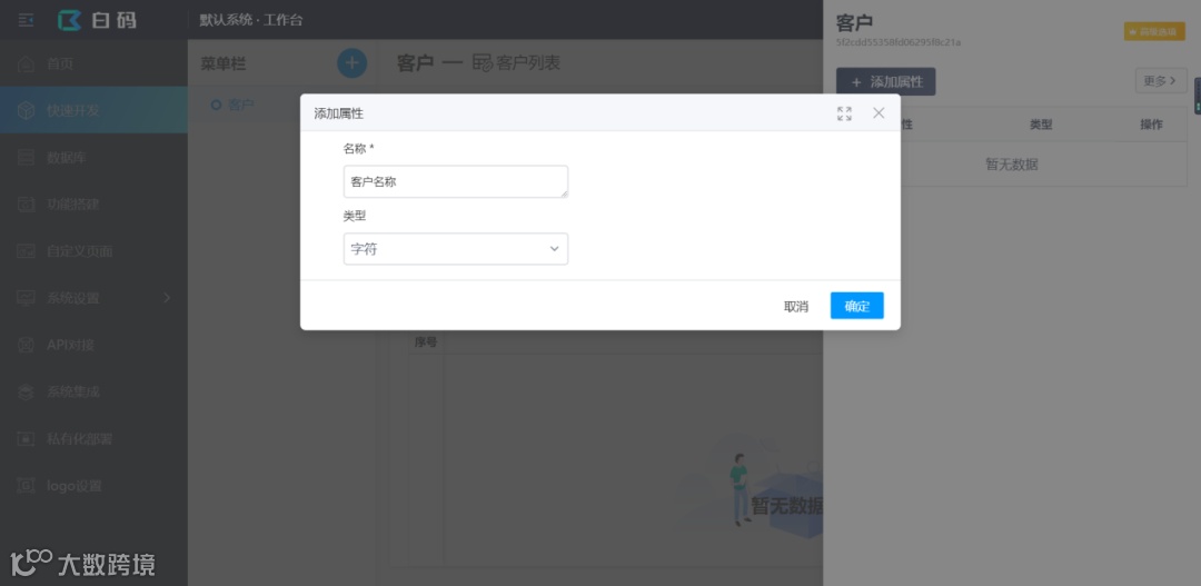 根据需求在新增的数据表上添加属性,属性类型根据实际情况选择,比如客户名称属于字符串类型。