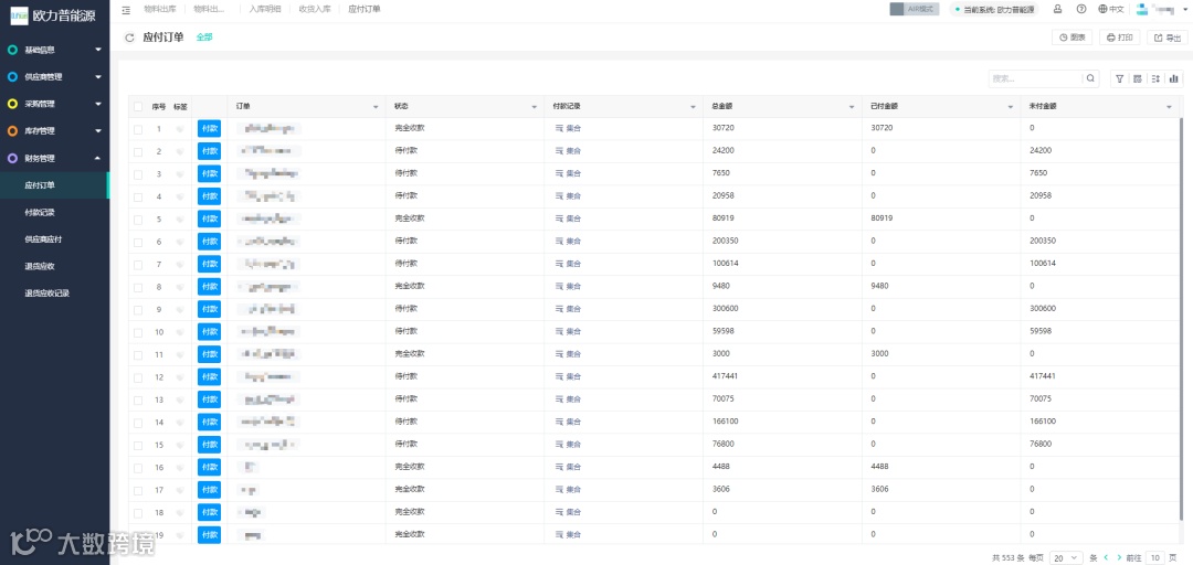 欧力普能源采购管理系统帮助客户实现无纸化记录财务信息,同时显示出订单的不同状态以及那个应付、已付、未付的具体金额情况。