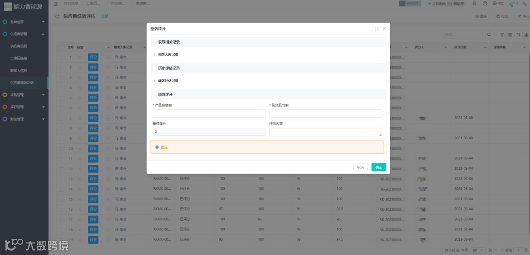 欧力普能源采购管理系统帮助客户解决供应商绩效评估无法根据供应商出入库进行评分,在评分时,可以随时查看供应商的相应入库记录,也可以查看改供应商既往的绩效评估。