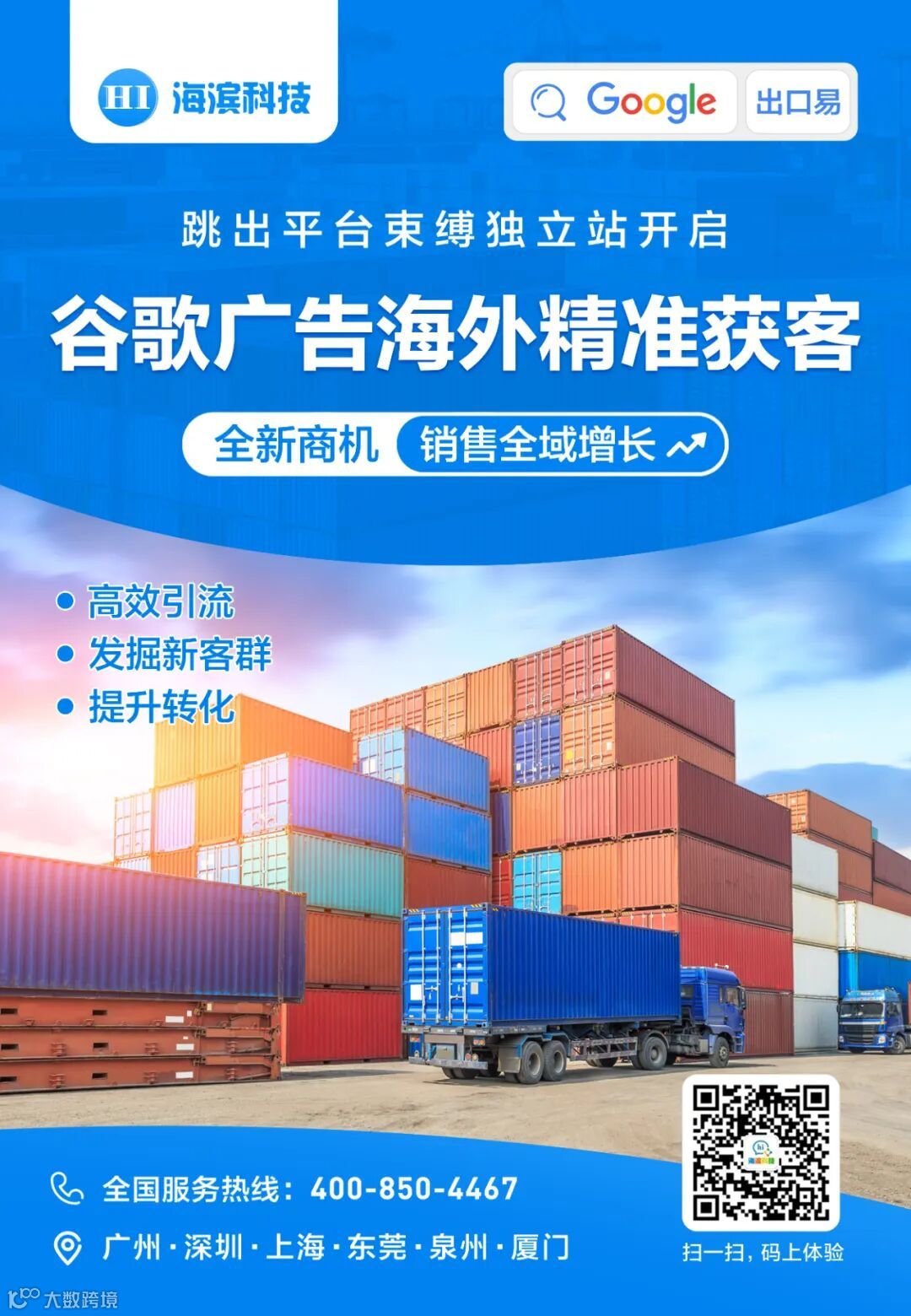 海滨科技简称广州海滨网络、隶属于广州海滨数码影像材料有限公司全资事业部,于2012年成立,广州为运营总部,并相继在佛山、深圳、香港、东莞、中山、三亚、荆州成立分公司和服务中心,公司凭借自身多年互联网实战经验、成熟的技术团队支持,在PC互联网、移动互联网端、有成功的经验。响应国家“一带一路”政策,助力中小企业发展,实现企业品牌出海!