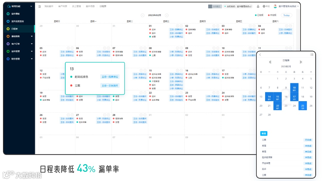 日程表降低43%漏单率:设置律师日程安排,及时跟进案件情况,漏单率降低43%。