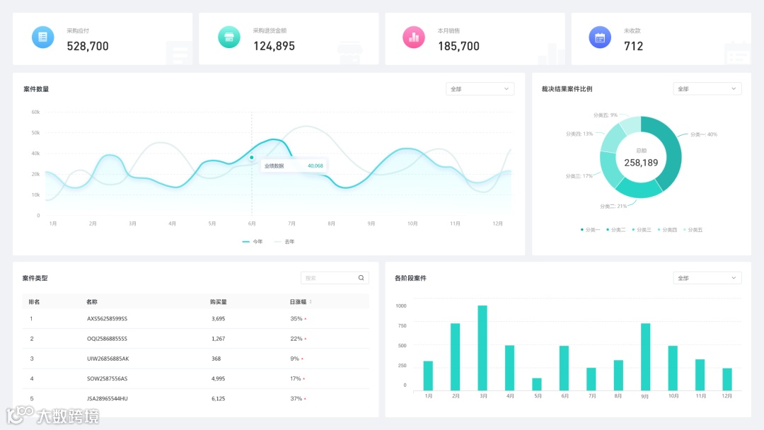 8.将案件数据转化为直观的图表,如柱状图、饼图等,一目了然地掌握案件的类型、阶段等。