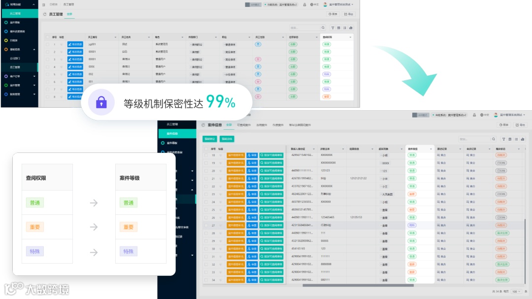 等级机制保密性达99%:能够自定义员工查阅案件的等级,保障律所案件信息不会被泄露。
