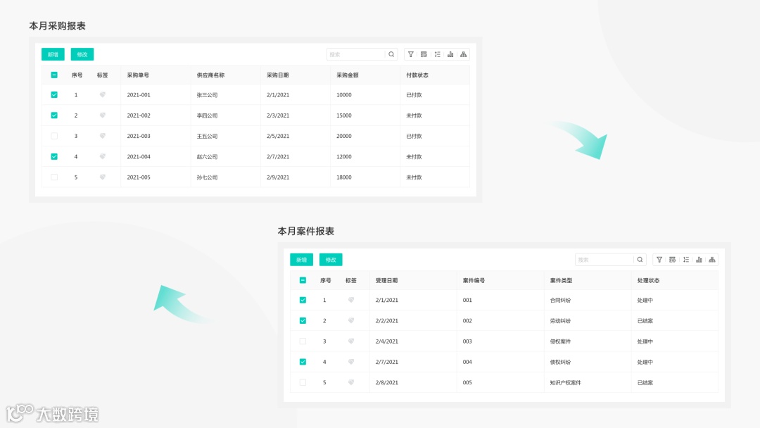 一键生成自定义案件报表:能够根据自己的需求,自由组合,个性化生成组合财务订单应收报表、案件月报等,方便管理和分析。