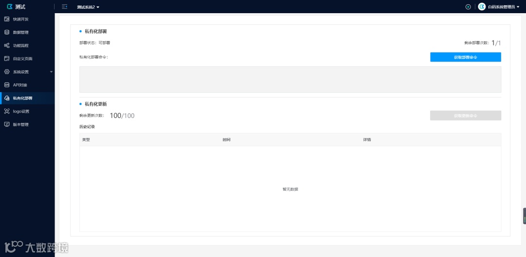 企业版用户可在该页面自行获取部署命令,分为首次部署带数据的部署命令和更新部署的命令,如需更多的获取次数,可联系客服咨询。
