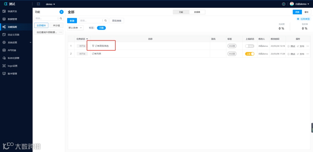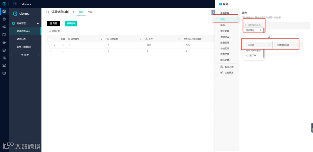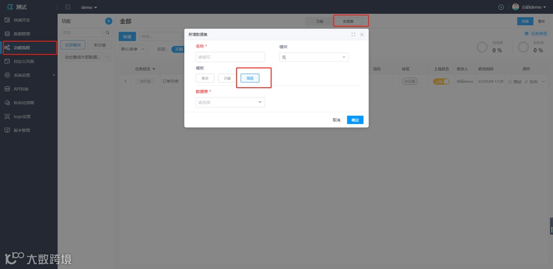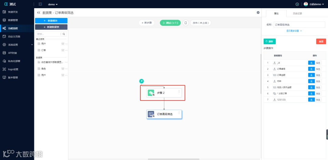 功能流程,数据集页面新增“高级筛选”的功能,常用于中间表的筛选或多种查询条件组合的查询。