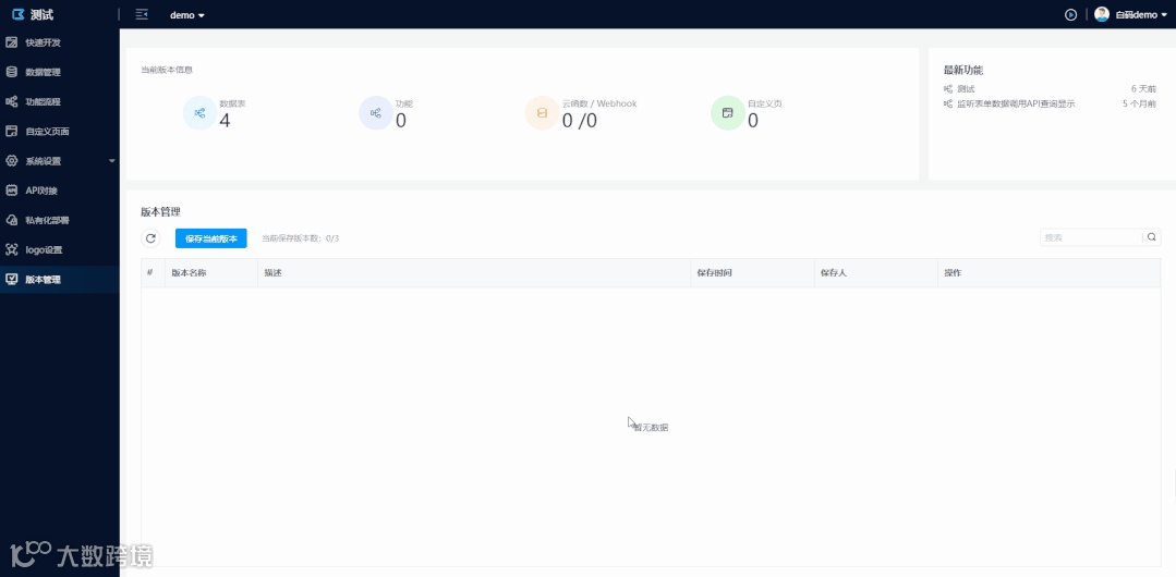 系统开发完毕且使用了一段时间后,需要进行二次开发的情况下,害怕改错。可以先保存一个版本,再进行开发,开发过程中发现无法进行下去或有其他问题需要回滚,就可以在这里进行版本回滚,可精确到只回滚单个功能/单个字段/单个数据表/单个API/自定义页等。