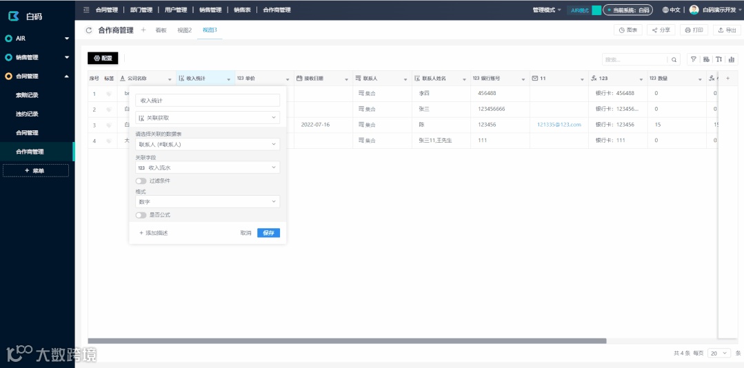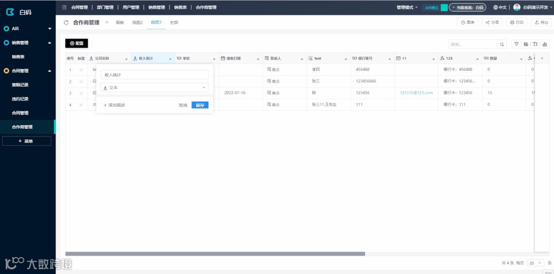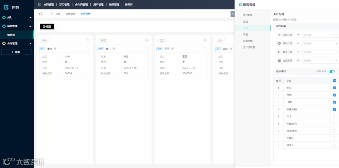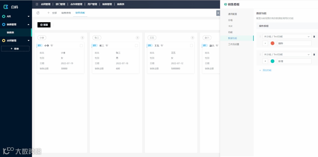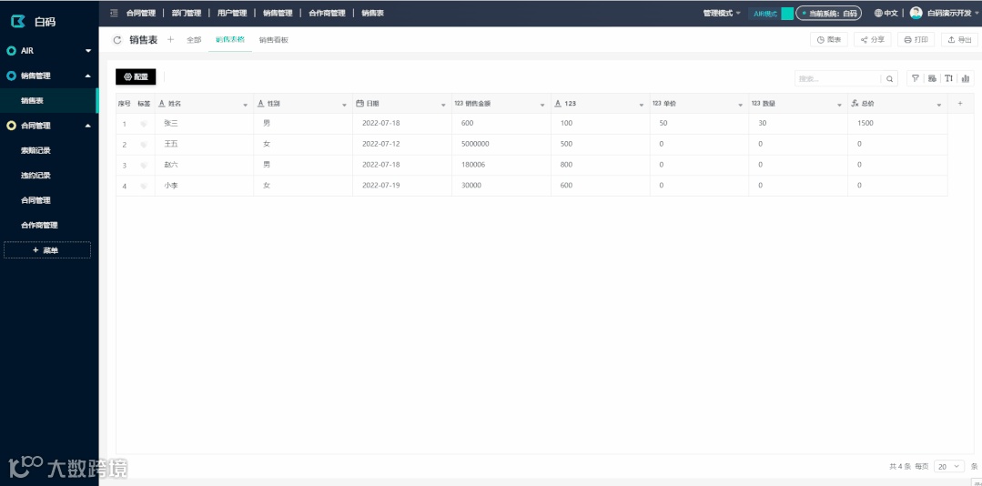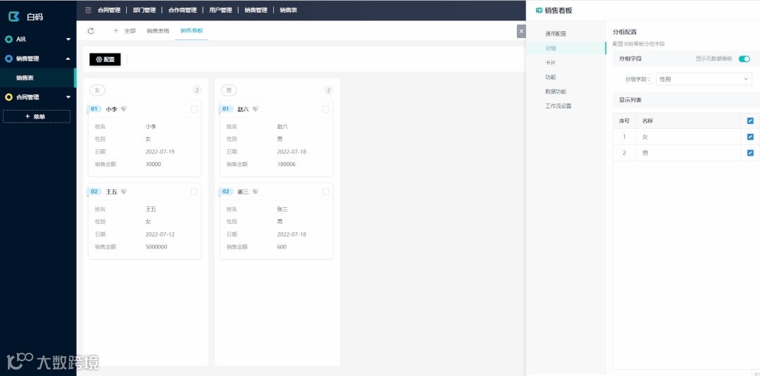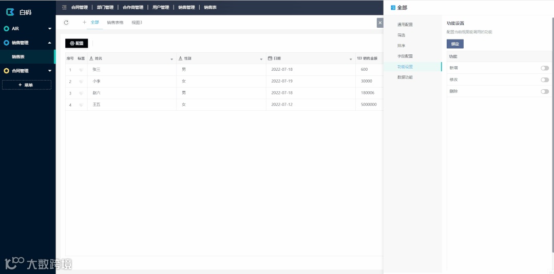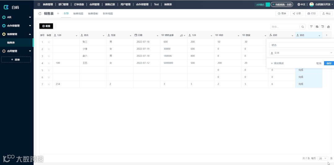AIR模式下,我们支持表格和看板功能(白码AIR2.0,还会更新“日历“,”甘特图“等更多视图样式)。视图除了设置样式外,我们还可以给视图配置权限,筛选,甚至触发功能。