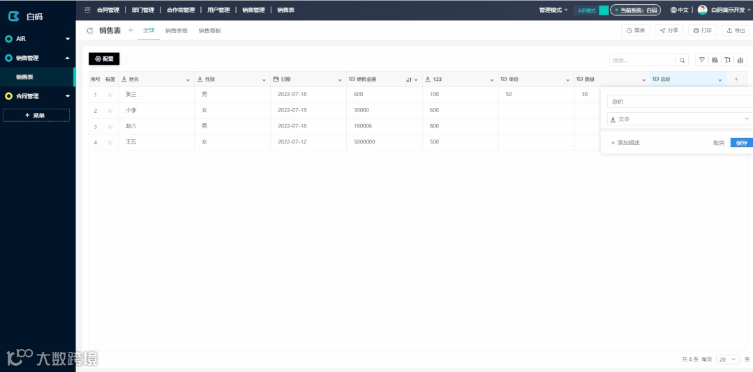现在通过新的AIR模式下新建的字段,可以直接进行数据的操作,你可以直接选中一个数据来进行快速修改(AIR2.0,白码还会迭代被动式业务流触发配合表内修改)