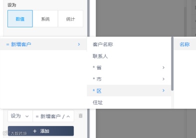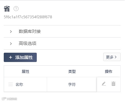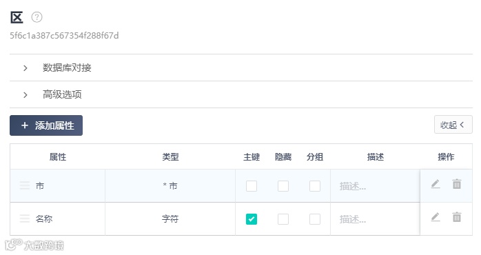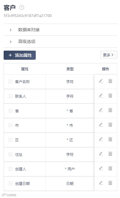 为了能够实现级联选择,需要在第二级以上的选项添加关联上一级的属性,且主键必须是对应的名称,因为我会用到平台提供的关联属性的下拉选择功能,选项只会显示对应的主键,根据官方的说明,没有设置主键的数据表,会默认将第一个属性作为主键;客户数据表中的住址属性只需要设为这三级选项对应名称的拼接即可。