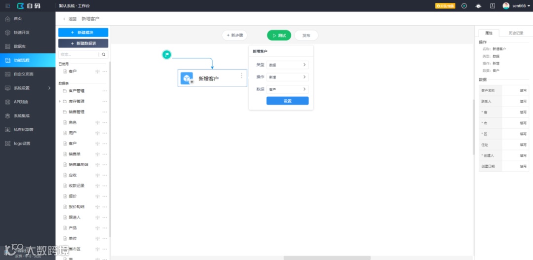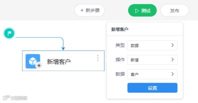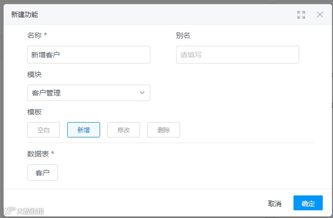 创建一个新建客户的功能,可使用平台提供的功能模板,快速创建一个基础的新建功能,再进行操作设置的调整。