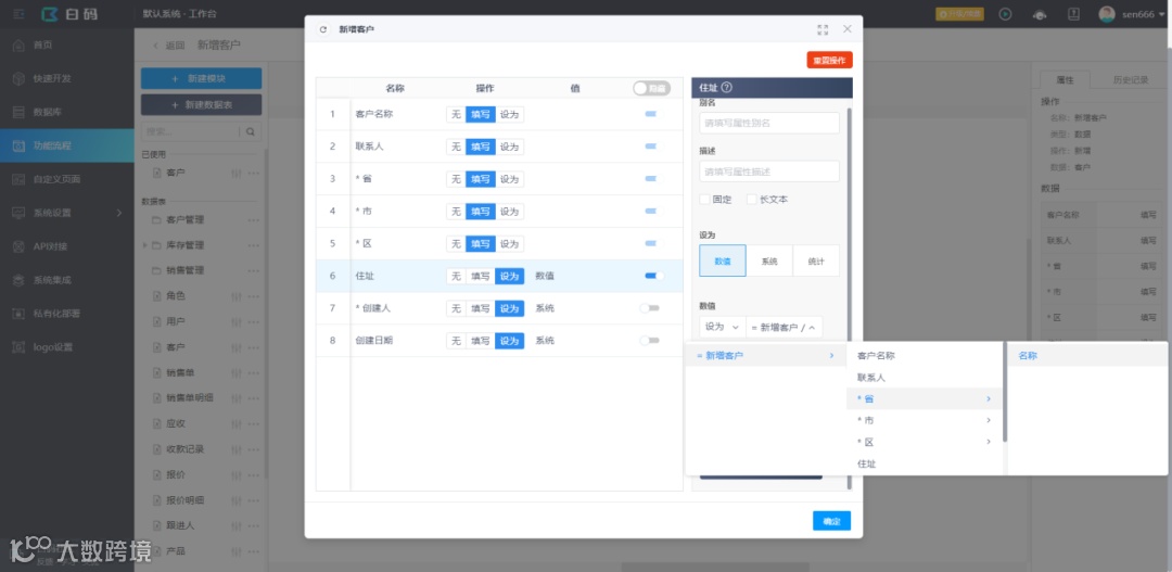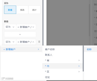 在新建客户功能中实现省市区级联选择,并将三项属性合并到住址属性。