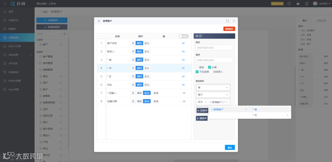 此外,市和区属性需要设置筛选条件,即市数据表中关联省的属性必须等于前面选择的省,区属性同理,住址则属性设为省市区三个关联属性对应名称的拼接,省+市+区;