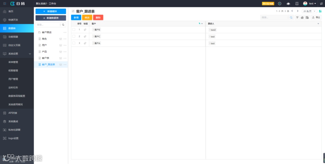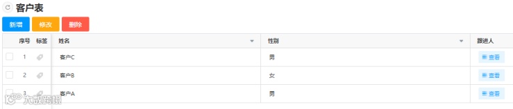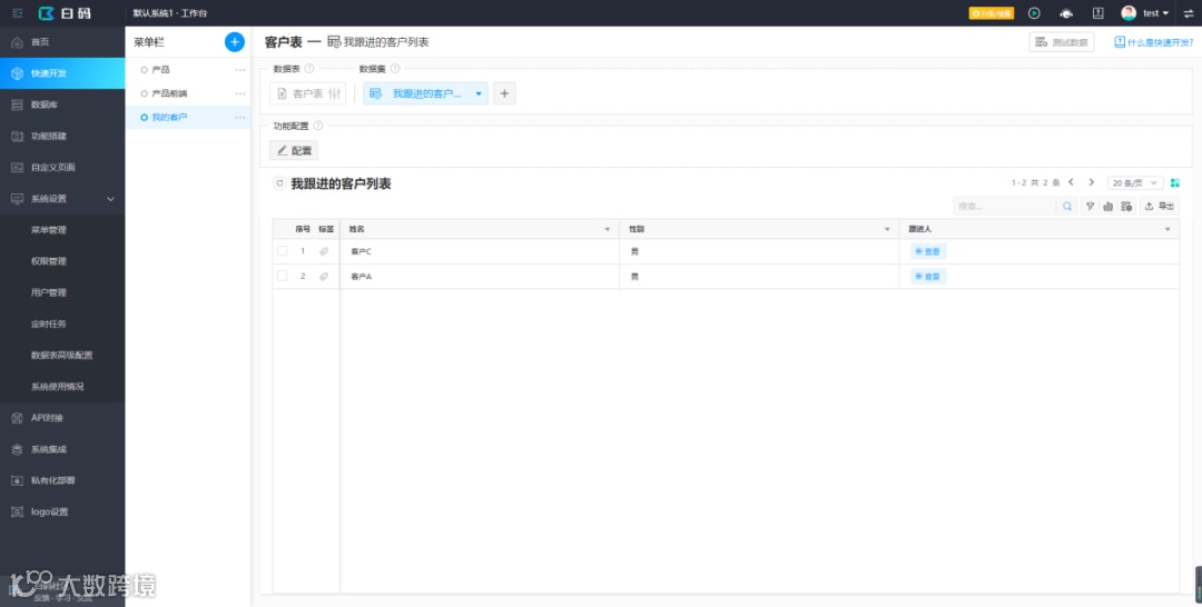 在快速开发中添加菜单“我的客户”,选取刚刚发布的“我跟进的客户列表”数据集,就可以在这个菜单查看客户数据。为了方便测试,我直接在数据库中添加测试数据: