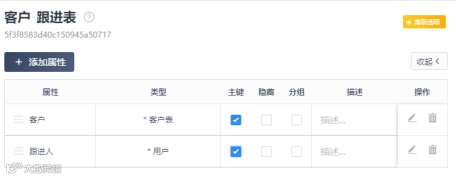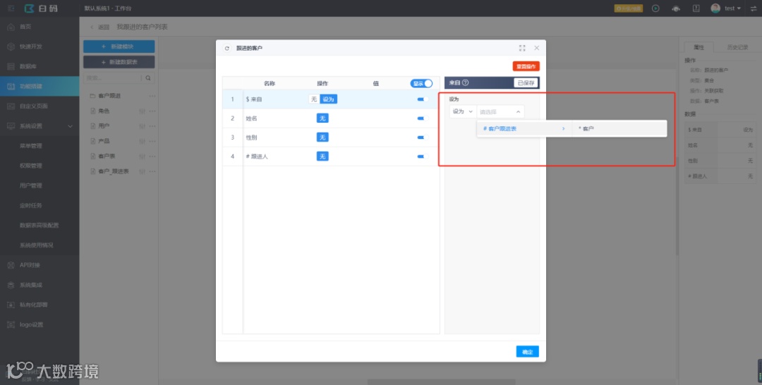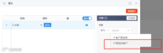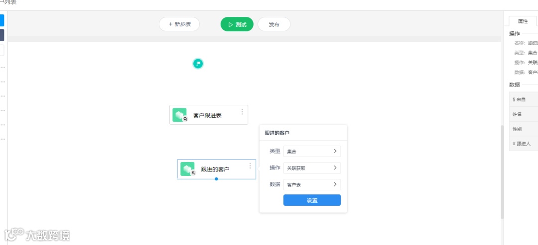 添加步骤“跟进的客户”(操作设为关联获取),打开设置,将“$来自”属性设为上一步骤(客户跟进表)的客户数据。