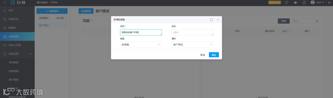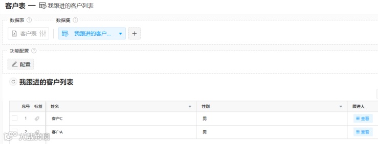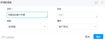 在功能搭建中创建1个跟进客户数据集,用于显示“我”跟进的客户。