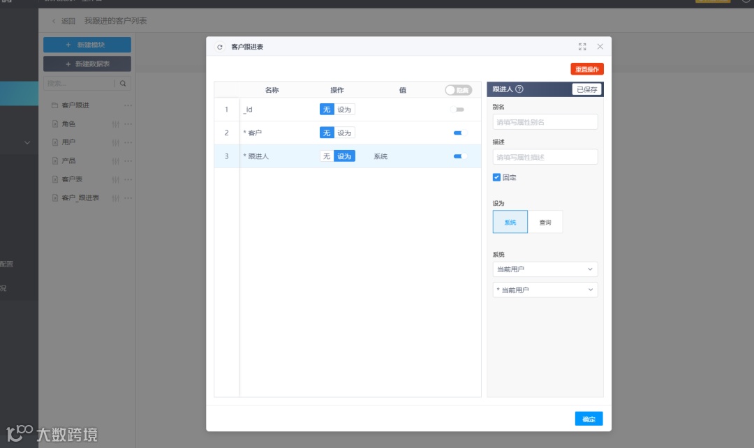 点开设置,将跟进人设置为“系统当前用户”,以筛选当前登录系统的员工对应的跟进数据。