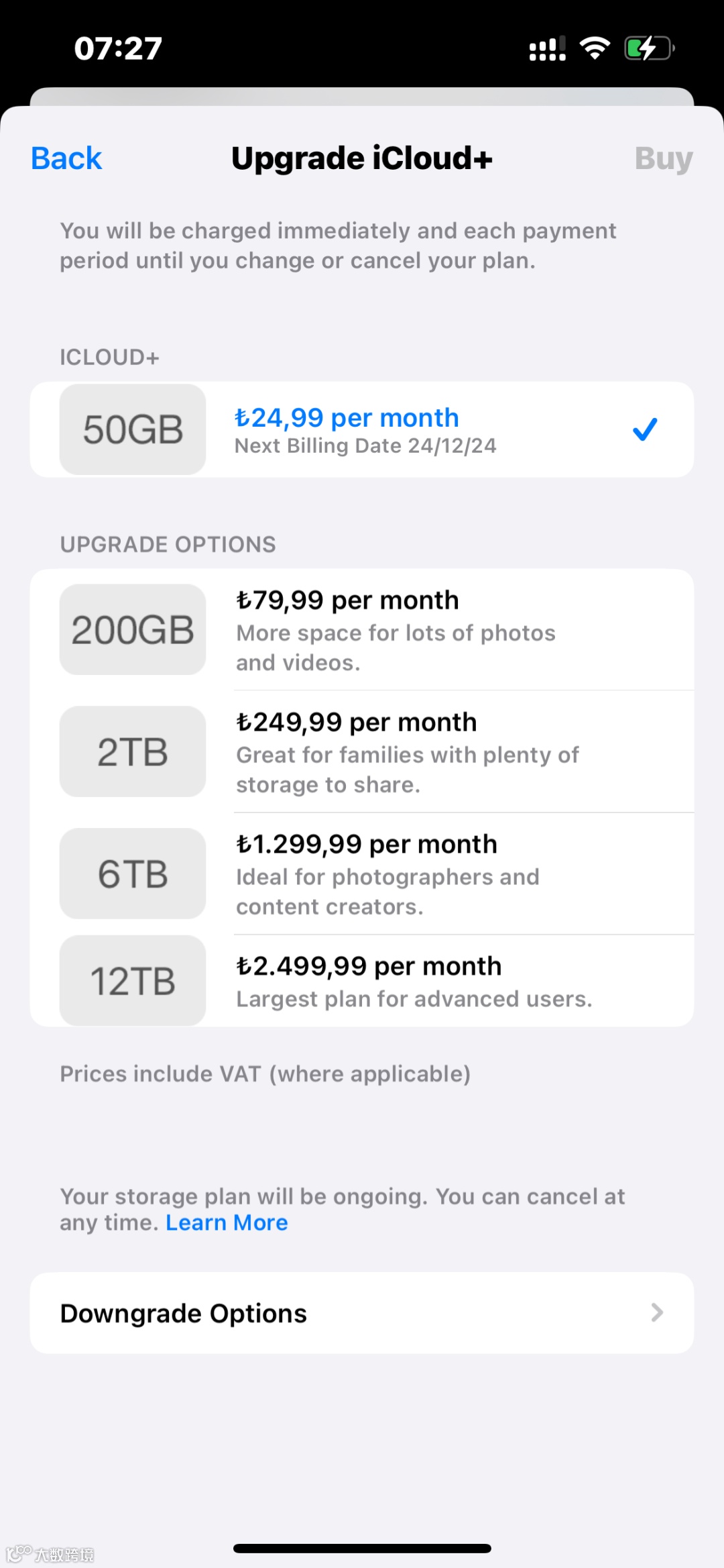 我现在用的是50G的,也够用了(因为我大部分资料保存在WPS 云盘和 坚果云上,只有一些照片,WhatsApp 聊天记录备份在 Icloud 上)