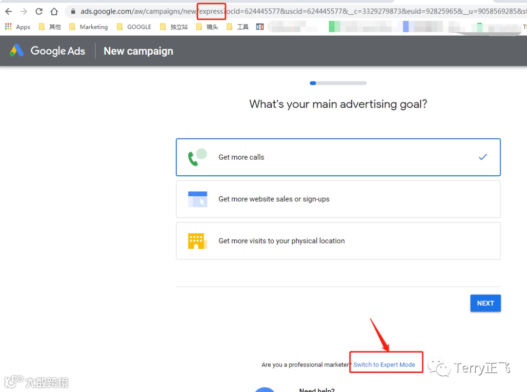 简单讲,就是简化版,你出钱,后面事情交给谷歌就好(说的倒是好听)。但同时意味着丧失很多主动权,加上效果不可控,所以还是强烈建议选 专家模式,点击下面的蓝色链接 “Switich to Expert Mode”: